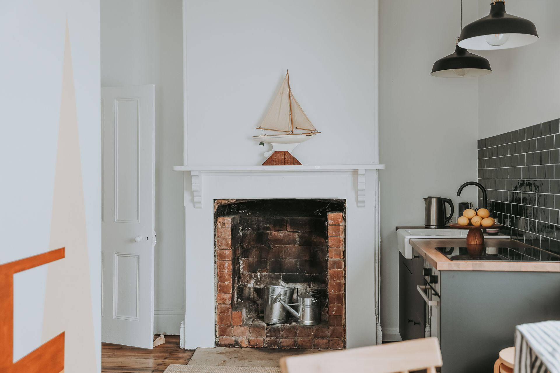 The space is equipped with modern electrical heaters, a functional kitchen, and beautiful soft furnishing.
