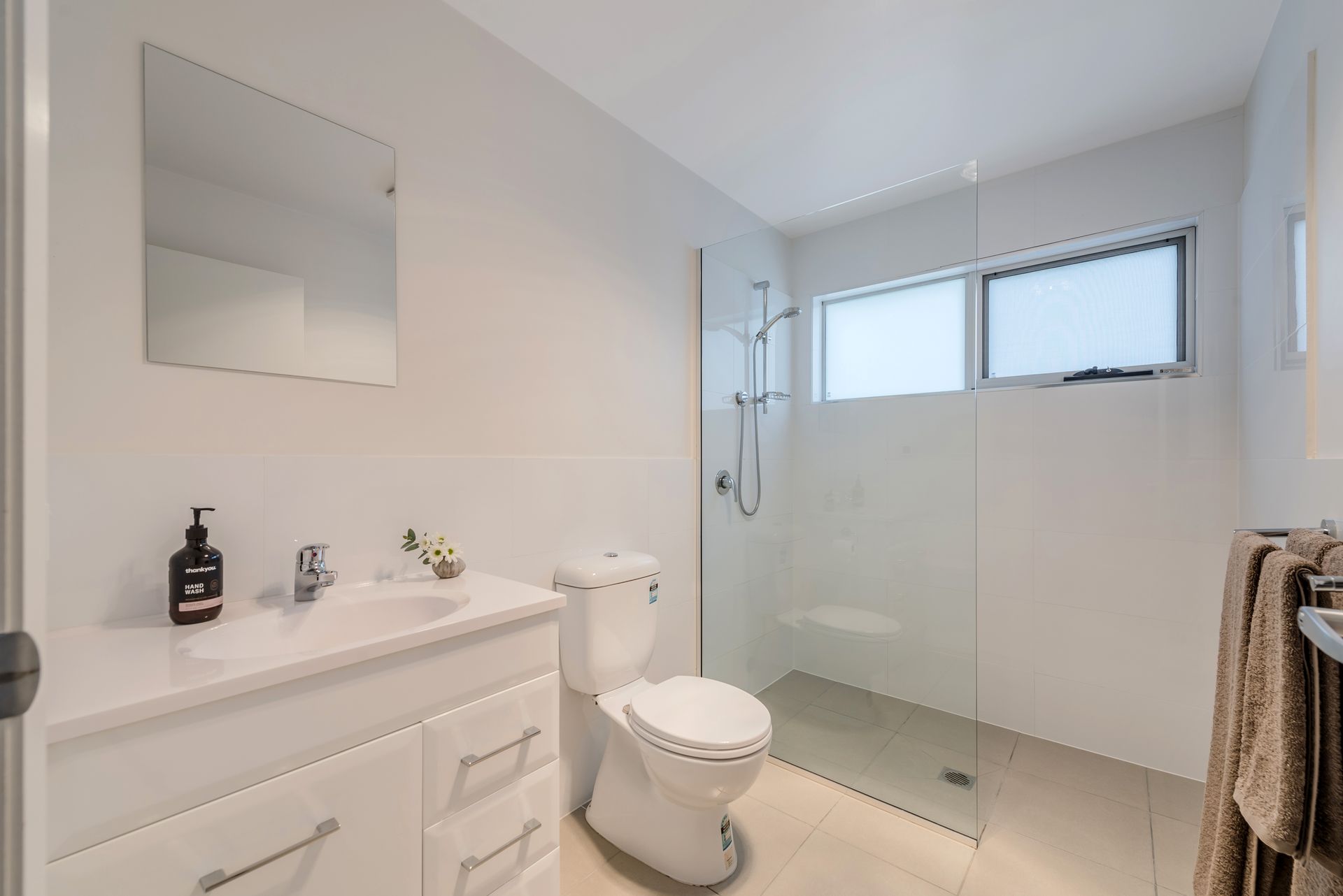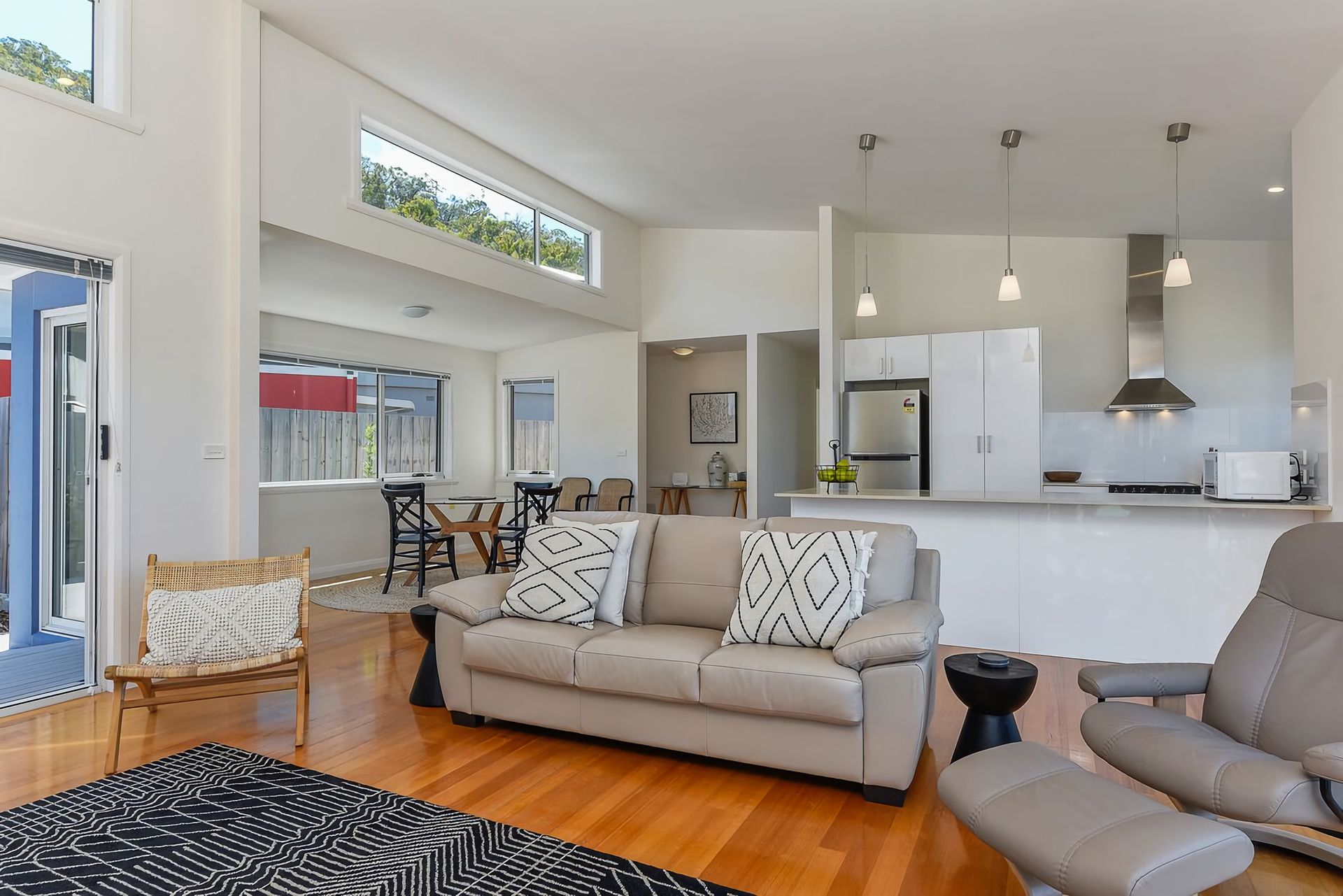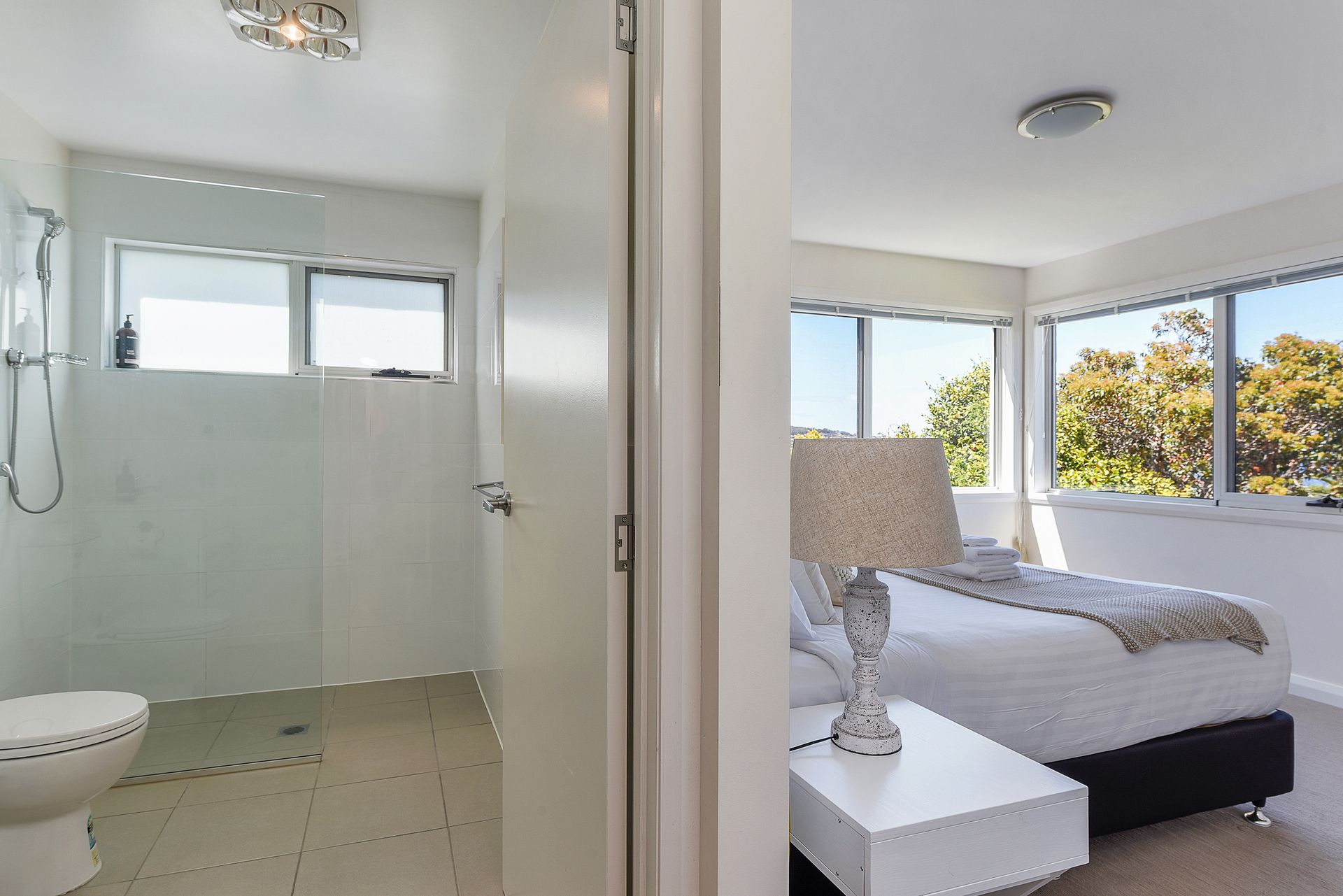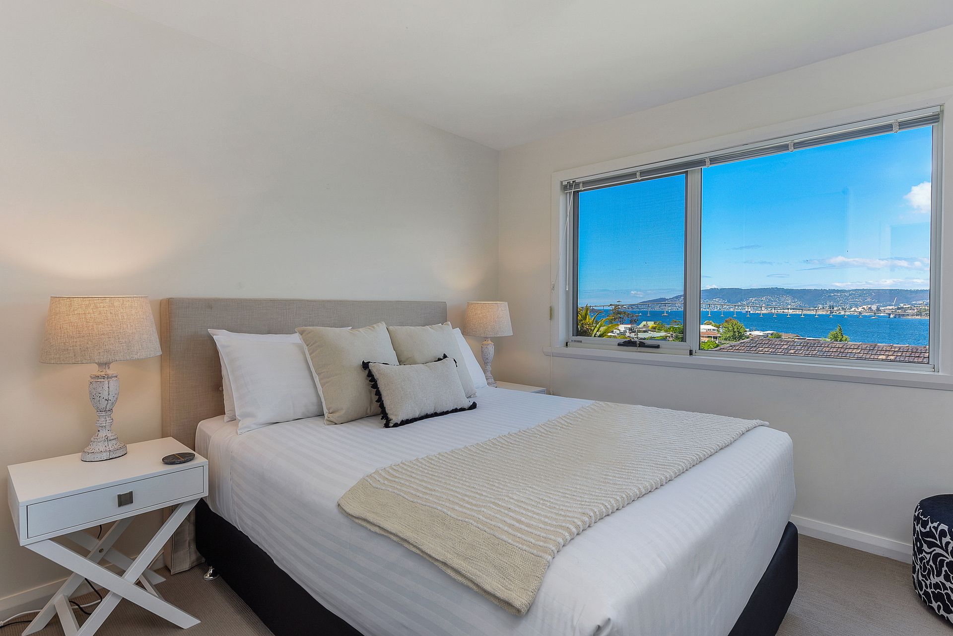 The accommodation comprises three beautifully appointed, generous bedrooms (one with king bed, two with queens) each with beautiful water views. All beds are furnished with quality linen and pillows to ensure your ultimate comfort and a restful night's sleep. The master bedroom features a walk-in dressing room and a stylish en-suite with glass walk-in shower, vanity and toilet, and the master suite can be closed off for additional privacy via the door at the end of the hall.