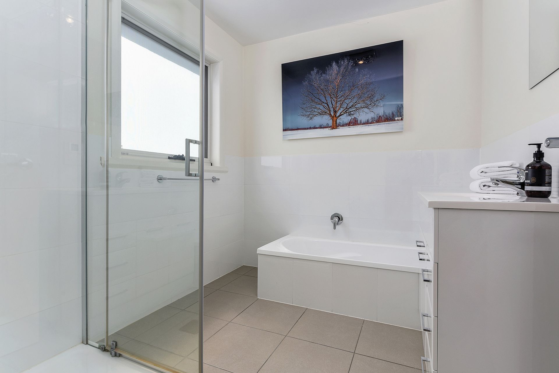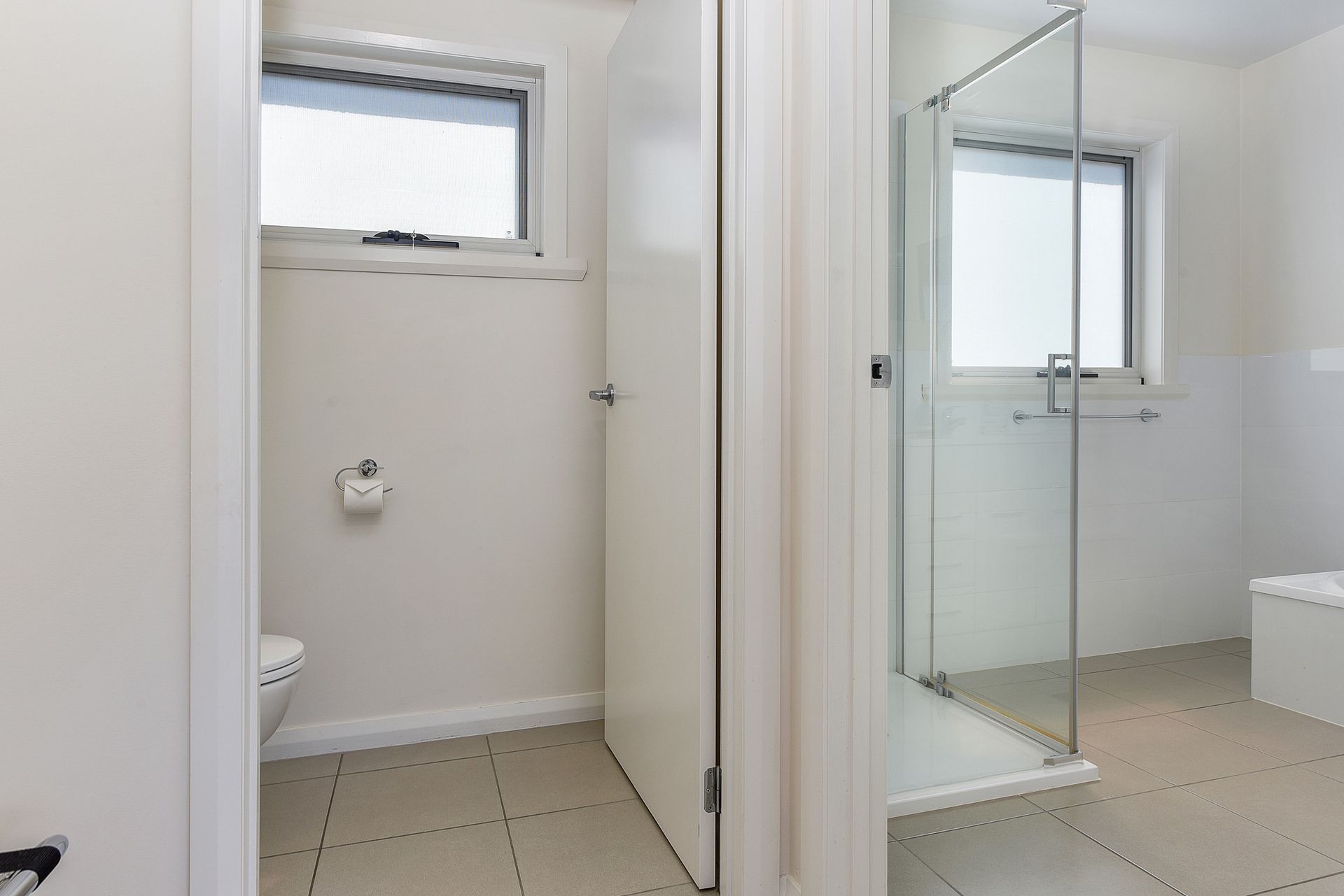 The main bathroom contains a bath, shower and large vanity. Conveniently, a separate toilet is located nearby.