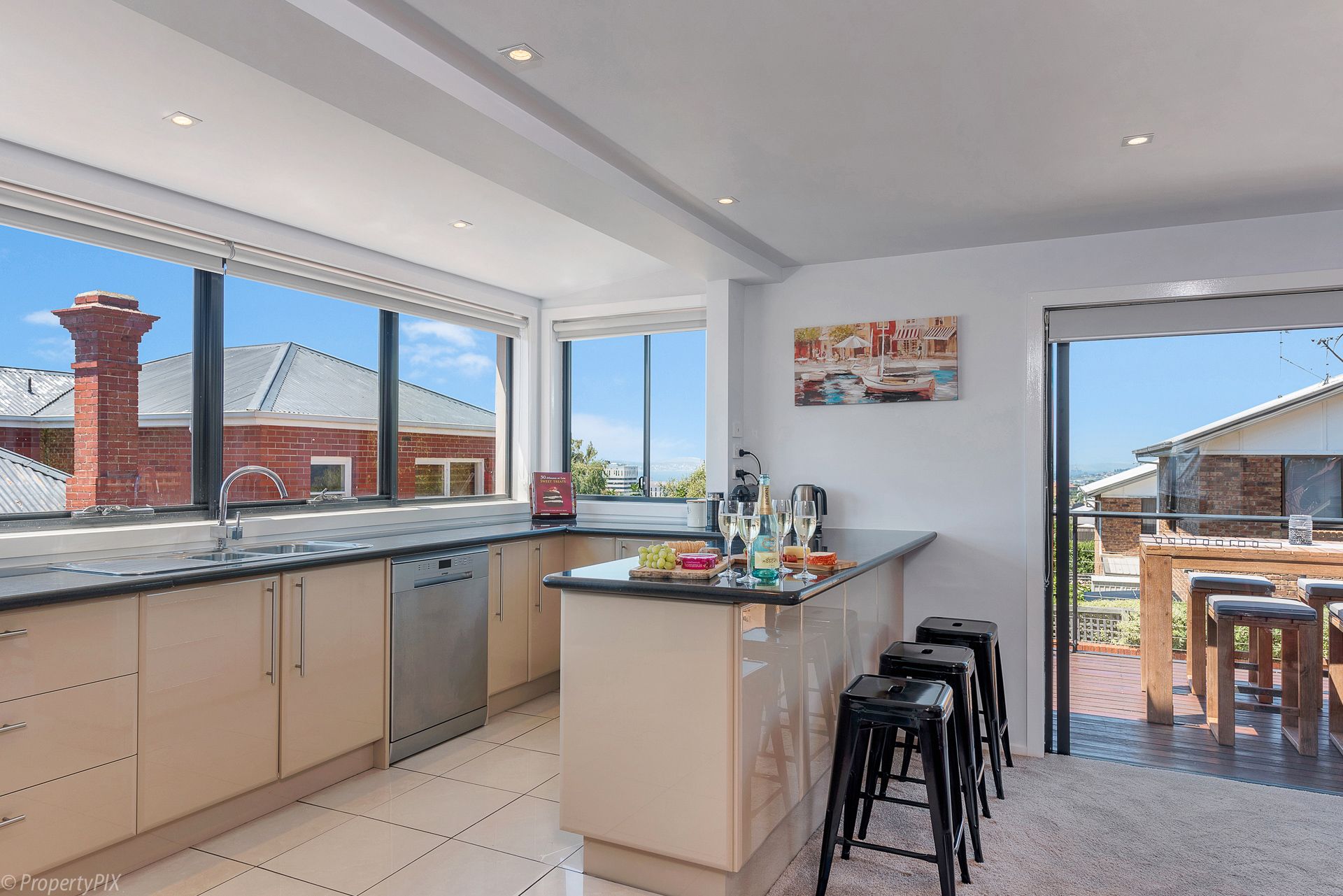 The open plan kitchen/dining/living space is bright and spacious and easily lends itself to accommodating groups of up to six. Listen to the birds and admire the river and city views over a leisurely BBQ on your deck...or cook up an evening meal in the well-appointed kitchen (tons of bench space!) against a backdrop of Hobart city lights.